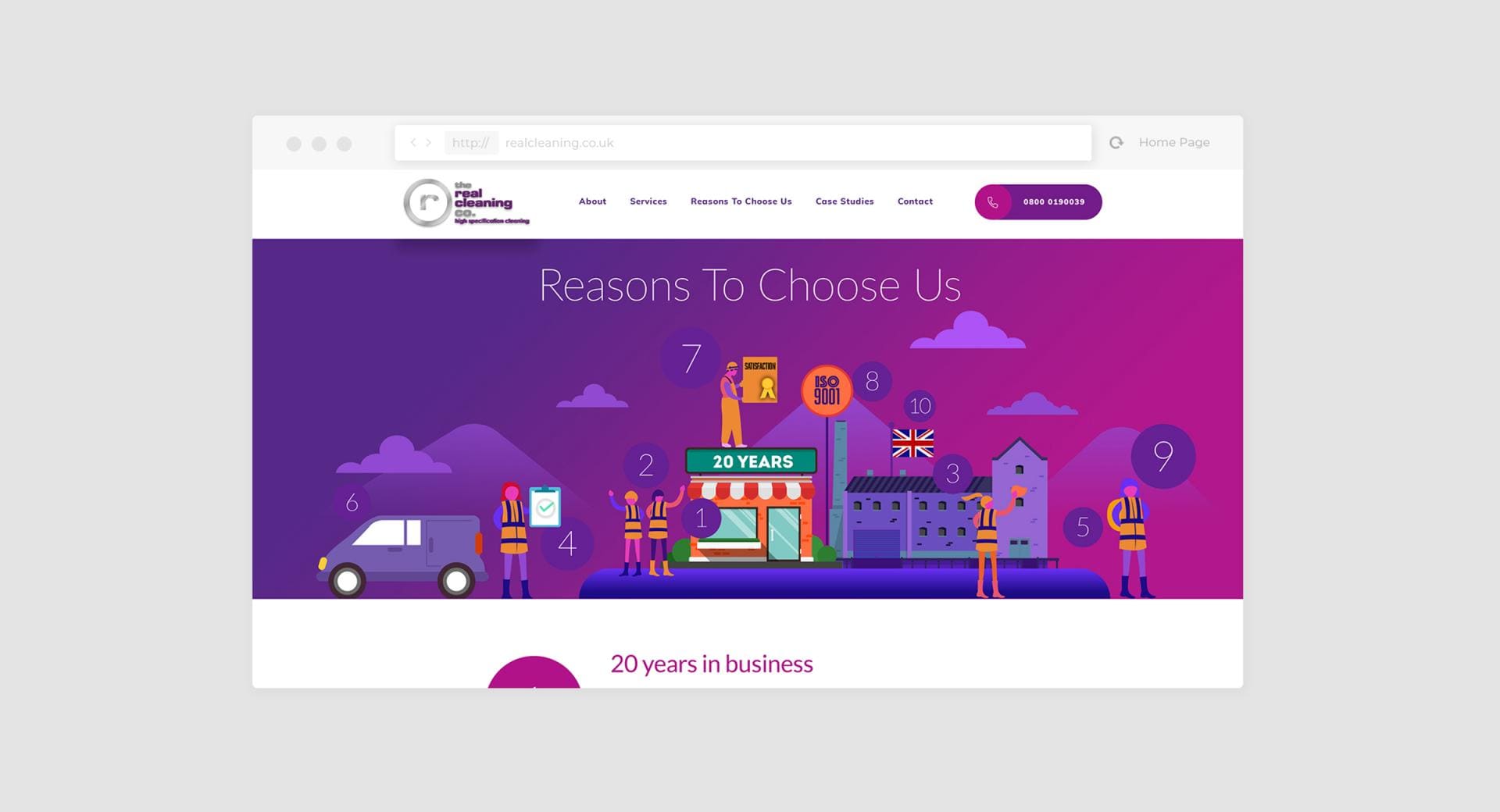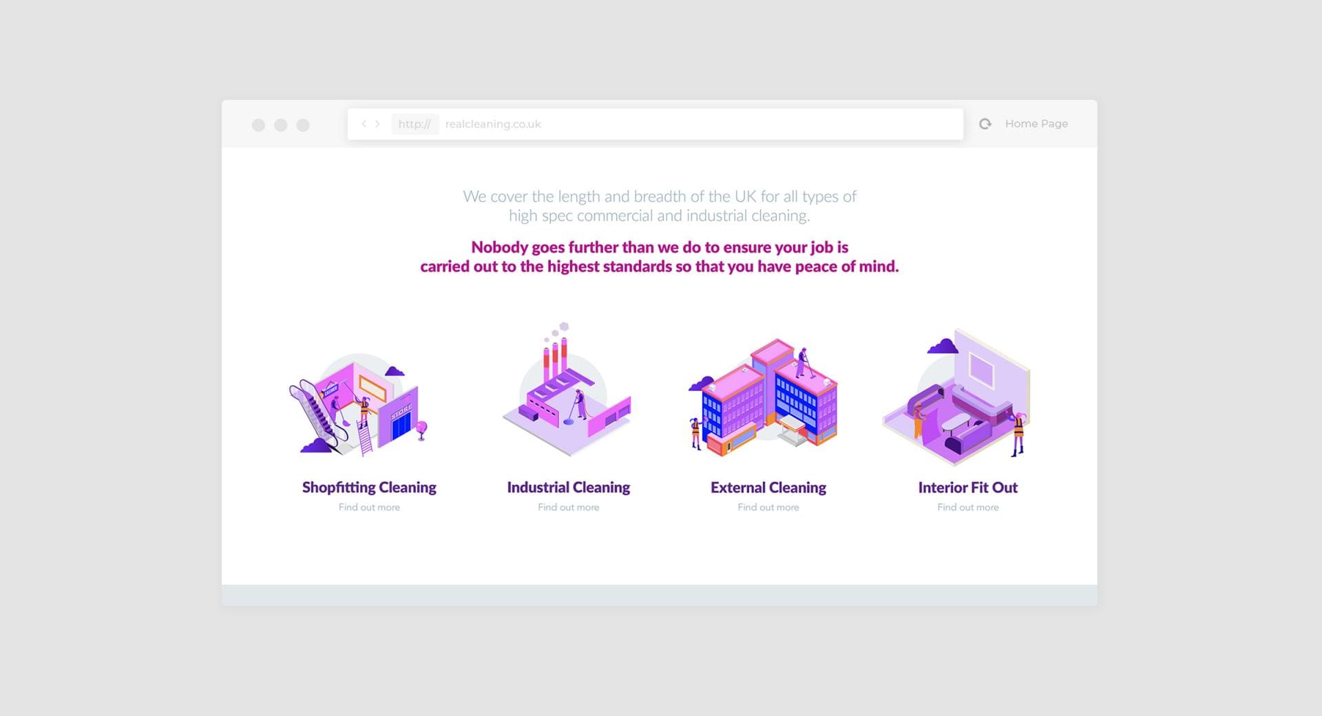 The consultancy work we conducted on the commercial cleaning market highlighted 25-30 competitors we needed to research and benchmark against. It became apparent that, of all these businesses, only 5 had a particularly strong image and clear offering. This gave us crucial insight in how we could be position the Real Cleaning Co brand.